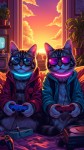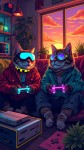 Stylish Cats in Colorful Gaming Room with Controllers, Digital Illustration
