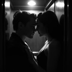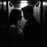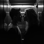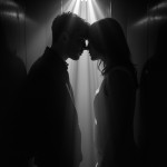 Two Young People Facing Each Other in Elevator, Mysterious Loving Look, Black and White