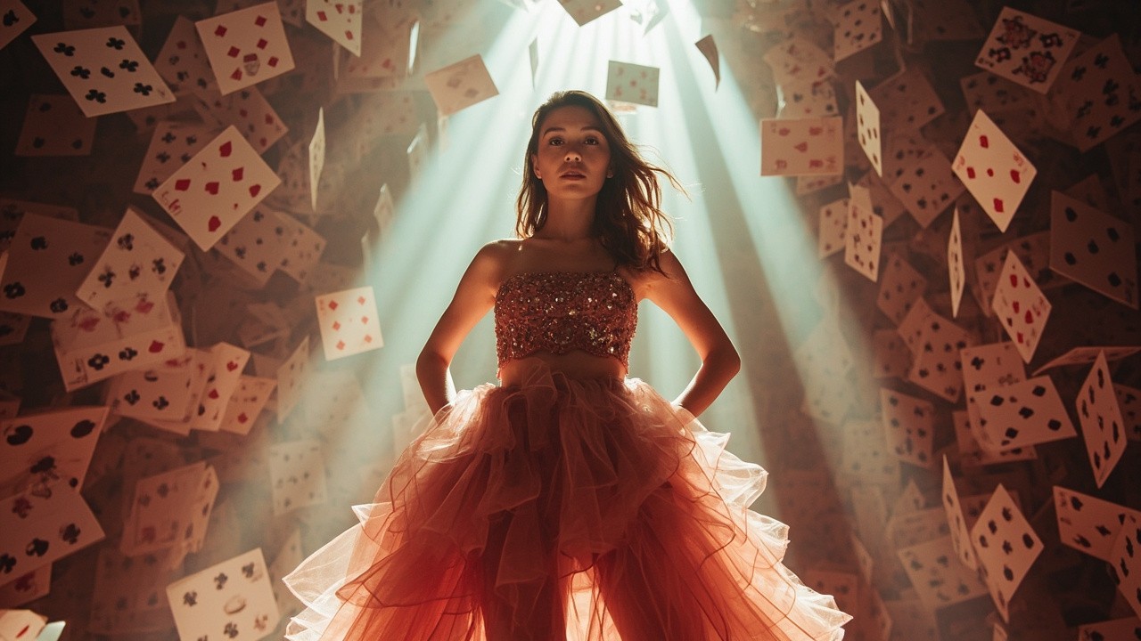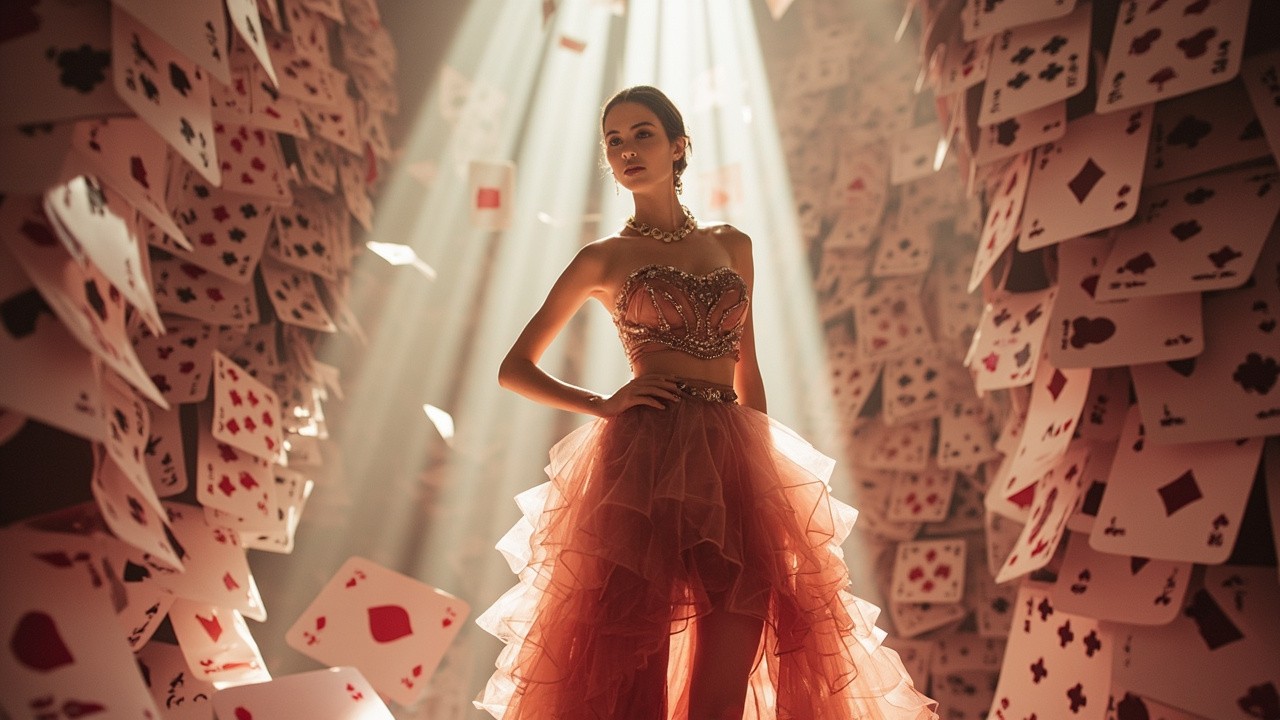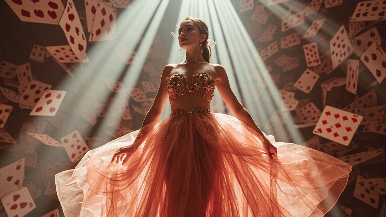 Created a full body portrait of a stylish young ukrainian woman wearing a vibrant dusty rose ensemble o0 strapless embroidered crop top with intricate beadwork and a matching high-low skirt made of multiple layers of sheer flowing tulle or chiffon creating a ruffled oluminous effect. stands confidently pose like a model in a surreal, towering environment made entirely of giant playing queen cards. The cards are stacked in massive columns reaching toward the ceiling, with some floating and tumbling in mid-air. Beams of dramatic light stream down from above, illuminating the woman and casting dynamic shadows through the layers of cards. Ultra-detailed, photorealistic lighting, depth of field, 8K quality.