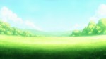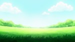 A high-resolution, realistic photograph of a peaceful natural landscape. The image should show a clear sky with soft white clouds, light green grass covering the ground, and natural green trees in the background. The lighting should look like real sunlight, soft and natural. The bottom of the image should have a darker green tone to help separate it from the foreground. No drawings, no artistic effects, no stylization. The image must look like a real photo taken by a camera. 16:9 aspect ratio, Ultra HD.