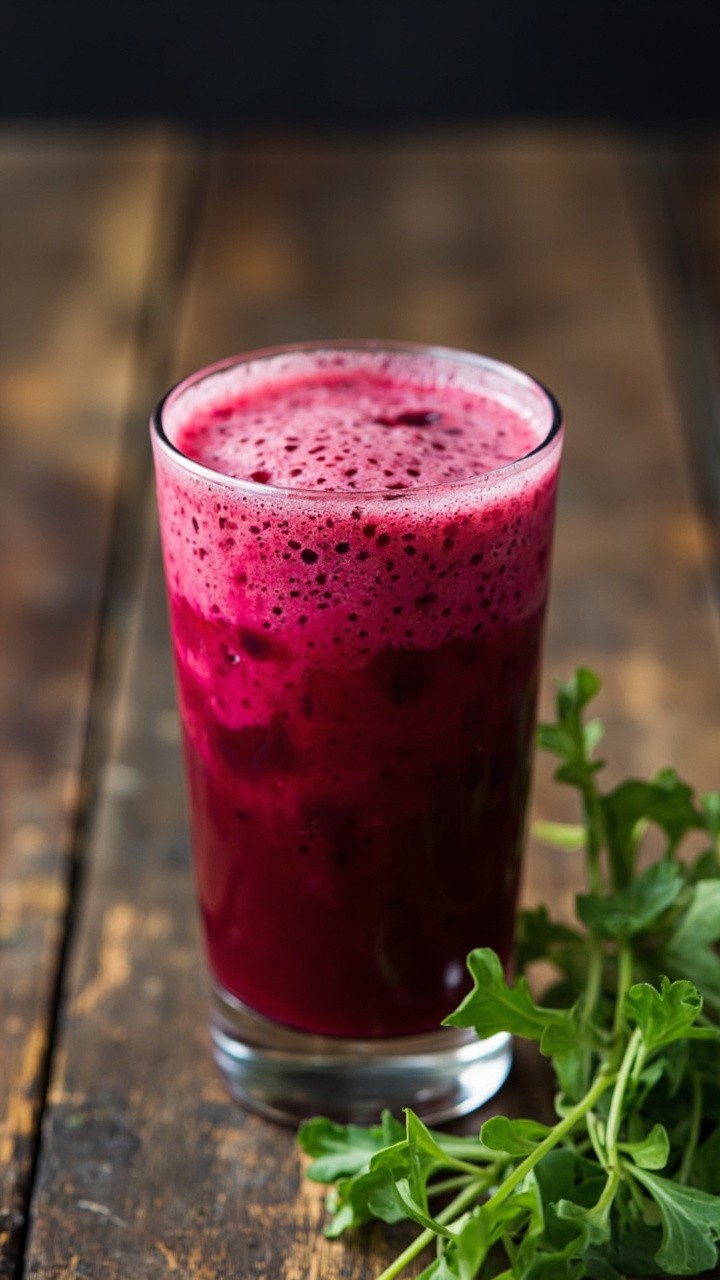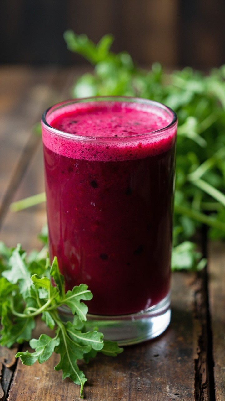 Vibrant Shot of Ruby-Red Beetroot Juice with Fresh Arugula