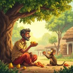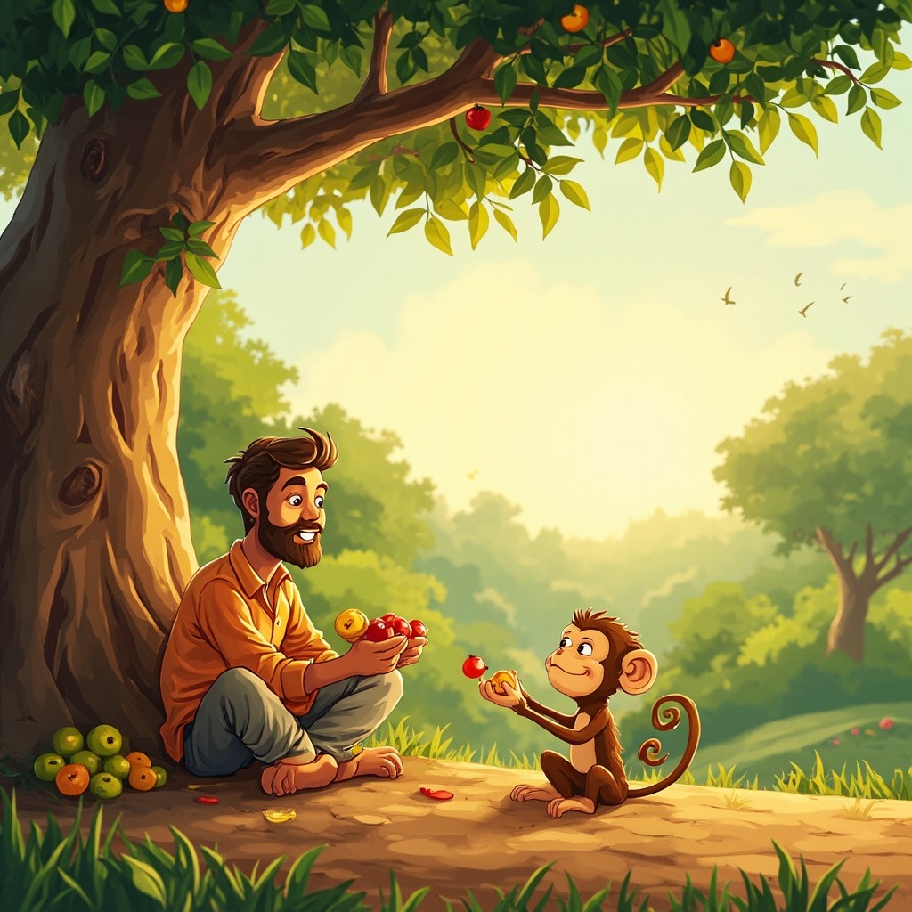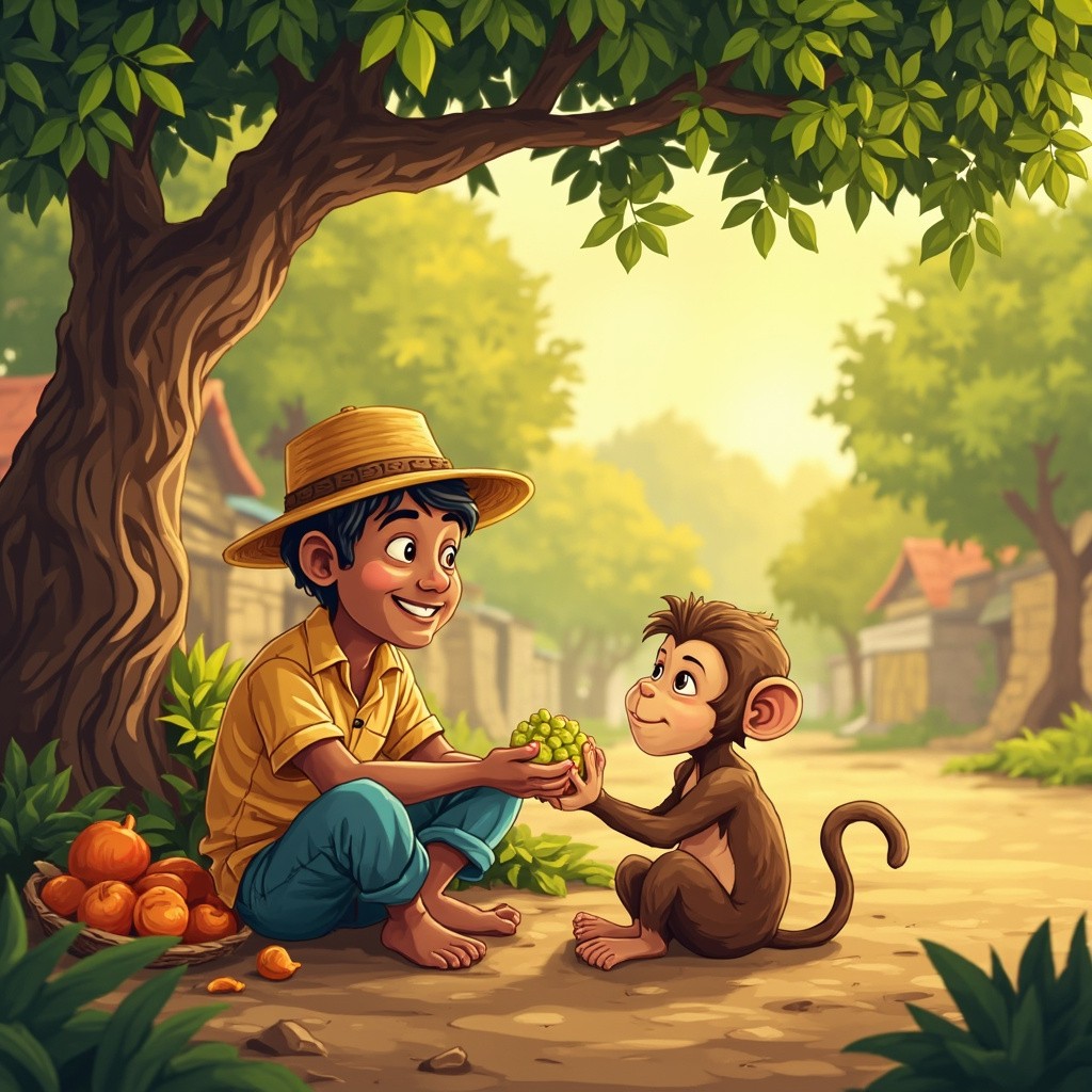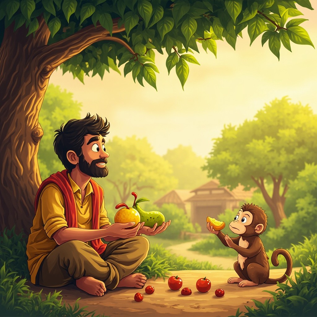 Kind Village Man Sharing Fruits with Monkey, Rural Odisha, Cartoon Illustration