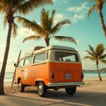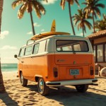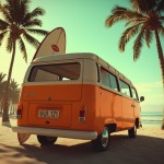 An orange Volkswagen type van, with a slightly vintage look, seen from three-quarter rear. It is parked near a heavenly beach with palm trees. A "smiley" sticker is stuck to the back of the vehicle. A surfboard leans on the side of the van. The rendering is photorealistic. The view is slightly low angle. The light and colors are rather soft without being bland.