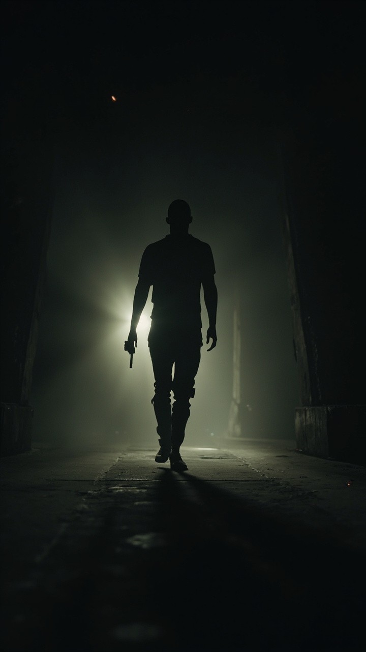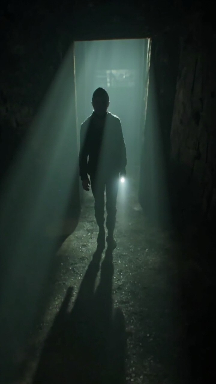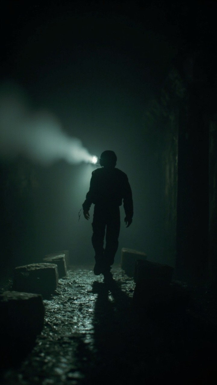 "First‐person human POV walking slowly through the same location. Realistic handheld movement with subtle footstep bob, slight sway, and imperfect motion. The viewer holds a flashlight; the beam reacts naturally with delayed movement, small over‐corrections, and uneven scanning. The character remains completely still and lifeless—no blinking, breathing, or motion. Only environmental movement: floating dust, faint light flicker, and minimal loose‐object motion. The environment stays unchanged—no teleporting, no new objects. Photorealistic found‐footage style, low‐light, strong shadows, gritty textures, and natural imperfections."