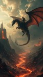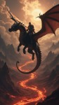 Warrior Riding Dragon Over Floating Islands and Lava Rivers