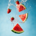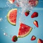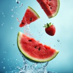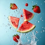 Slow-Motion Watermelon and Strawberries Toss with Blue Background