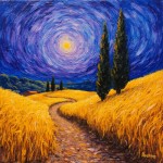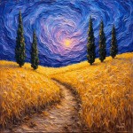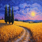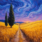 Twilight Wheat Fields and Cypress Trees with Brushstroke Texture