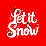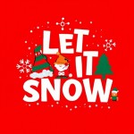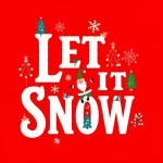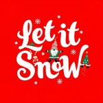 Stylized Christmas-themed typography design with the words "Let It Snow" in white on a red background, decorated with tiny gnomes wearing winter and snowflakes. The font is bold and whimsical, with playful details like small stars or pine trees around it. This design would be suitable for holiday cards, social media posts, or any project that needs an enchanting festive touch.