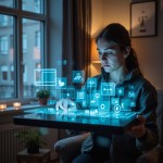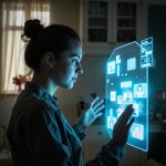 Young Woman Selecting Digital Apps on Holographic Interface at Home