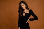 A medium shot captures a woman from the chest up, posing against a plain, warm brown background. She is wearing a long-sleeved, form-fitting black dress with daring cutouts on the chest and side. Her left hand rests on her hip, while her right arm is extended slightly to the side. The lighting emphasizes the contours of her body and the texture of her wavy, dark brown hair, which falls over her shoulders. Her makeup is subtle, with a focus on her striking blue eyes and defined features.