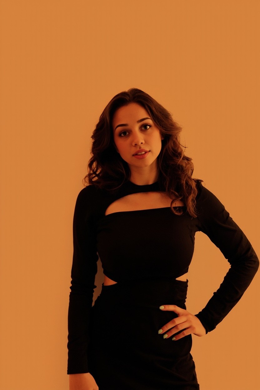 A medium shot captures a woman from the chest up, posing against a plain, warm background. She is wearing a long-sleeved, form-fitting black dress with daring cutouts on the chest and side. Her left hand rests on her hip, while her right arm is extended slightly to the side. The lighting emphasizes the contours of her body and the texture of her wavy, dark brown hair, which falls over her shoulders. Her makeup is subtle, with a focus on her striking blue eyes and defined features.