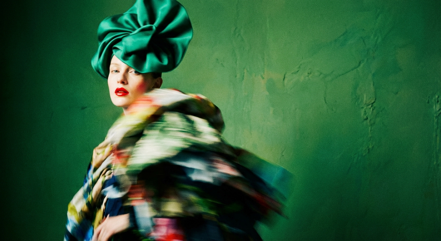Vibrant fashion photography of a stylish woman with red lips and a green hat.