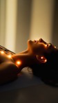 Side View of Woman Meditating with Glowing Chakras on Light Background