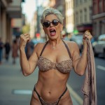 create humorous and funny image of woman over 40 with short gray hair and sunglasses and glamorous makeup posing in her underwear with a pair of pants in her hand with a surprised look on her face. I am trying to spoof all the influencers who show themselves in their underwear getting dressed in order to showcase an outfit. put her in a street scene looking surprized.