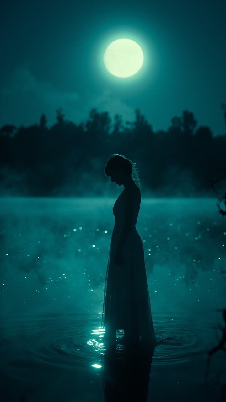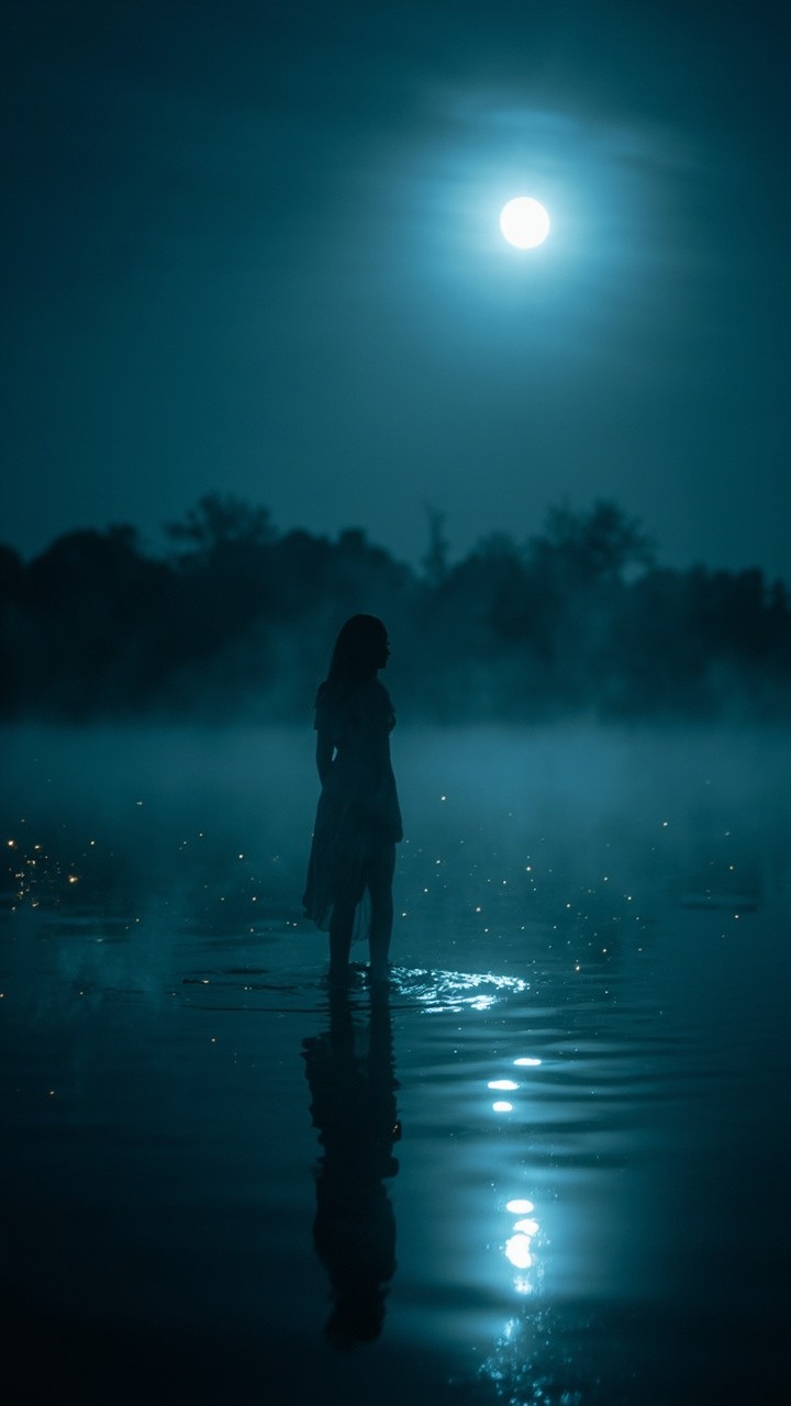 A cinematic, dreamlike night scene comes gently to life. A lone woman stands still beside a calm lake under a glowing full moon. The water softly ripples, reflecting moonlight in slow, shimmering motion. Thin mist drifts across the surface of the lake, moving calmly from left to right. Tiny glowing particles float slowly through the air, like fireflies or stardust. The camera performs a very slow, subtle push-in toward the woman, creating emotional depth without urgency. Her dress and hair move slightly with a soft night breeze. The trees in the distance remain dark and still, adding silence and peace. Lighting stays cool and moonlit, with soft highlights and gentle shadows. The overall motion is minimal, smooth, and meditative — no sudden movement. The mood is calm, safe, and introspective.