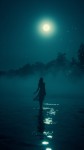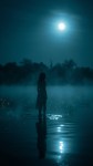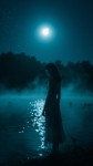 Moonlit Woman Standing by Calm Lake at Night