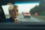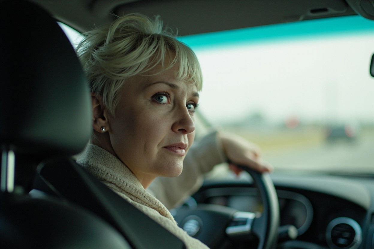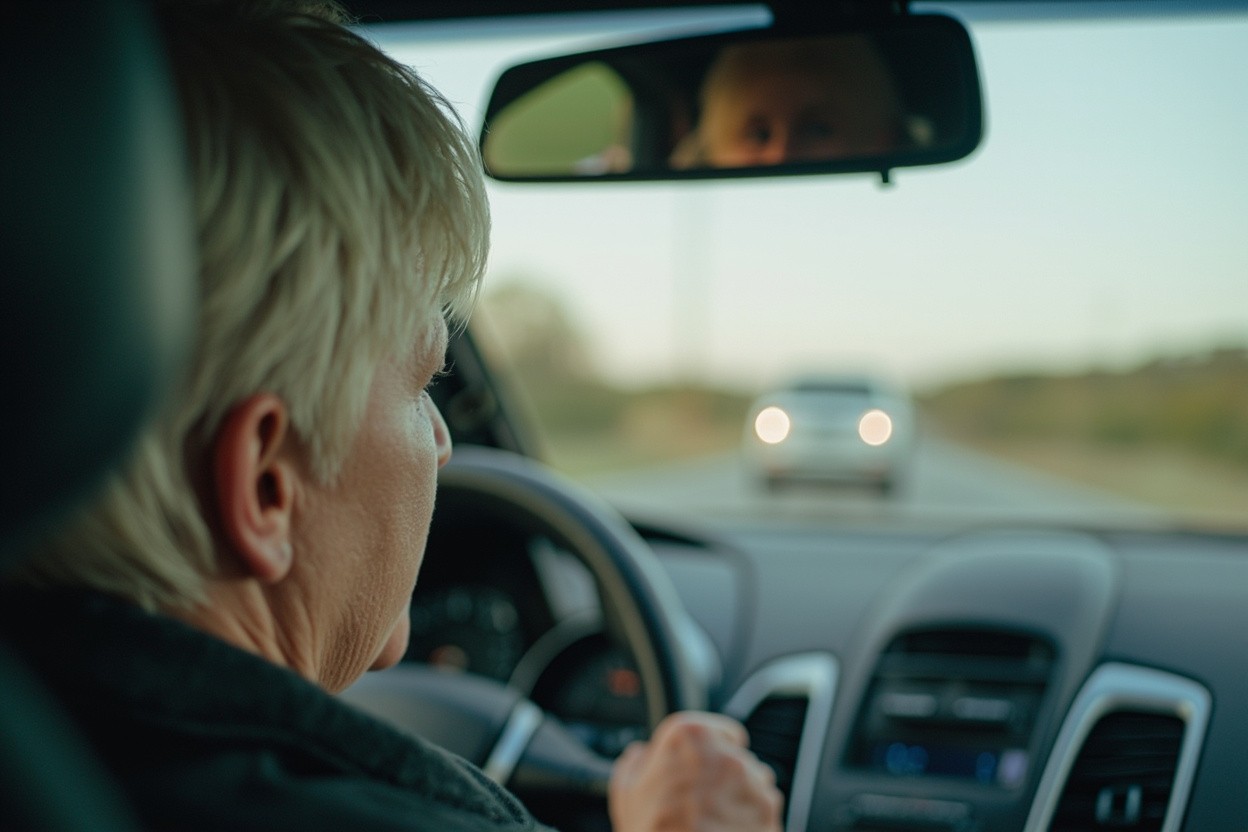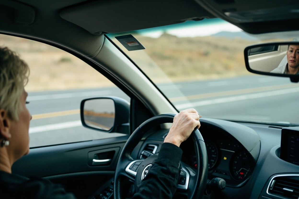 Mid 40's Woman Driving on Highway, Checking Rear Mirror