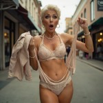 create humorous and funny image of woman over 40 with short blond hair and glamorous makeup posing in her underwear with a pair of pants in her hand with a surprised look on her face. I am trying to spoof all the influencers who show themselves in their underwear getting dressed in order to showcase an outfit. put her in a street scene looking surprized.