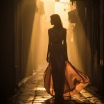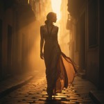 Woman in Flowing Silk Dress in Misty European Alley at Golden Hour