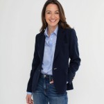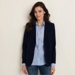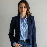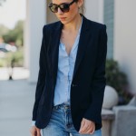 Woman Wearing Navy Blue Blazer, Light Blue Shirt, and Medium Wash Jeans