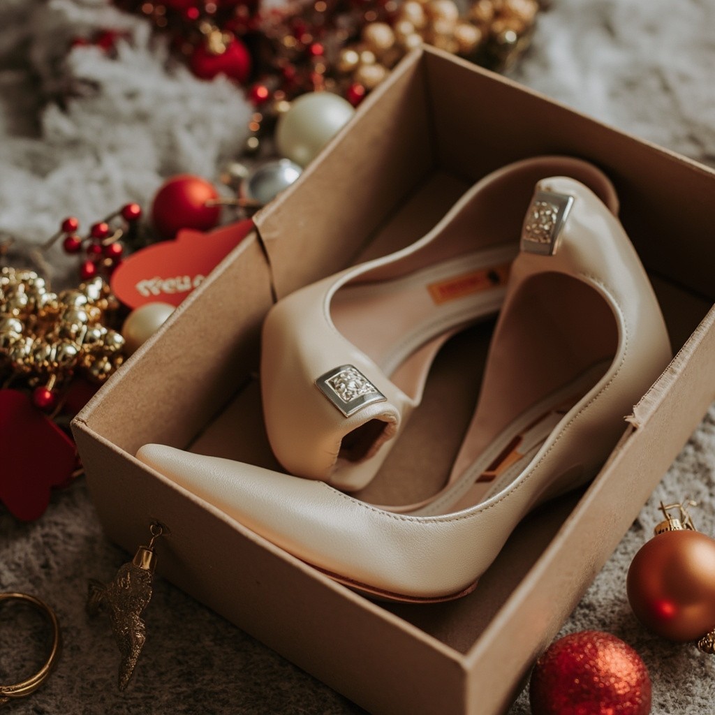 Women's High-Heeled Shoes in Box with New Year's Paraphernalia