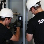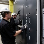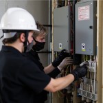 Workers in Black Shirts and White Helmets Using Black Gloves on Electrical Board