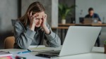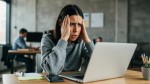 this 40-year-old woman worried sitting in her desk while looking at her laptop screen. She has a concerned expression on her face while seeing bad results in her laptop screen. She is wearing a grey sweater. Her posture is engaged, with both hands gently touching her forehead looking worried. On the desk, there are a few items including a notebook, a smartphone, pens, sticky notes, and a small potted plant. In the blurry background, another person is working at a separate desk near a concrete wall. The atmosphere is bright, clean, and focused. The photo is taken at a slight diagonal angle from a mid-height point of view, emphasizing depth, lighting, and the interaction between the subjects and their workspace.