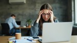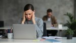 Worried Woman at Desk Looking at Laptop with Colleague in Background