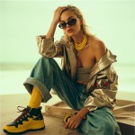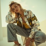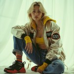 A high-fashion photoshoot for Vogue magazine, featuring a stylish model with blonde hair, wearing a yellow necklace and dressed in a Y2K-inspired outfit by Balenciaga. The outfit includes low-rise jeans, an oversized metallic jacket, and chunky platform sneakers, with bold logos and futuristic details that capture the essence of early 2000s fashion. The image has a Y2K aesthetic with a grainy filter and vintage film texture, capturing the retro-futuristic vibe of the early 2000s. The model's pose is elegant, with a slight tilt of the head and a confident gaze, reminiscent of the Y2K era. The lighting is soft with a subtle glow, emphasizing the model's features. The background is minimalistic, allowing the model to be the focal point. Shot by photographer Bill Cunningham. Ultra-high definition, highly detailed, 8K resolution, vintage film grain, aspect ratio 9:16.