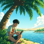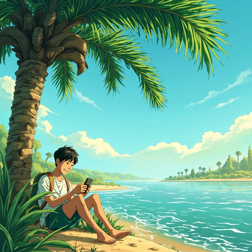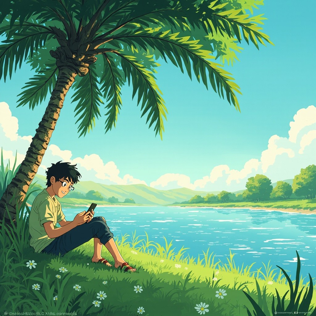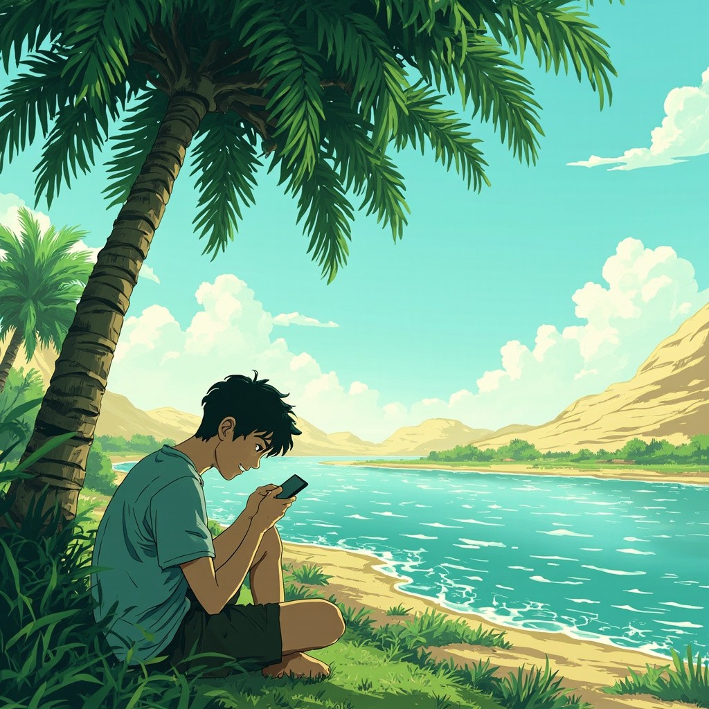 > Prompt: Studio Ghibli style illustration. A determined young man/woman looking at a smartphone with a smile, sitting under a palm tree on the banks of the Nile. The river is sparkling, and the sky is clear blue. Peaceful yet energetic aesthetic, lush green colors, high detail, theme of productivity and hope.