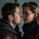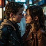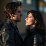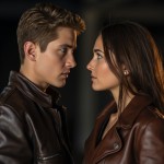 Young Man and Woman with Blue Eyes in Leather Jackets Looking at Each Other