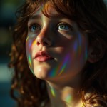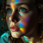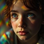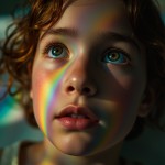 A hyper-realistic close-up portrait of a young person’s face, partially submerged in soft shadow and illuminated by refracted rainbow light patterns. The subject’s green-blue eyes gaze upward, lost in thought, with delicate freckles, dewy skin texture, and soft curls of auburn hair partially visible. The light reflections resemble stained glass or water reflections, casting ethereal colors across their cheeks and forehead. Mood: introspective, dreamy, surreal. Style: cinematic realism, shallow depth of field, high-resolution detail, bokeh effects in the background.