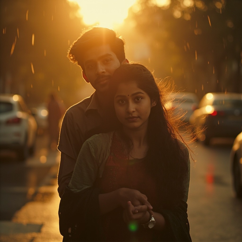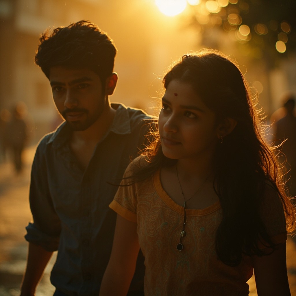 A young Indian boy slowly walking behind a girl on a rainy college campus evening, soft golden sunset light, slow motion scene, emotional romantic atmosphere, light wind moving her hair, cinematic camera movement, shallow depth of field, 4K ultra HD, dreamy background blur, soft piano music vibe, realistic expressions, Bollywood movie style, high detail, dramatic lighting, romantic mood