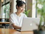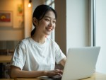 Japanese Woman Working on Laptop in Cafe, Casual Look, Natural Light