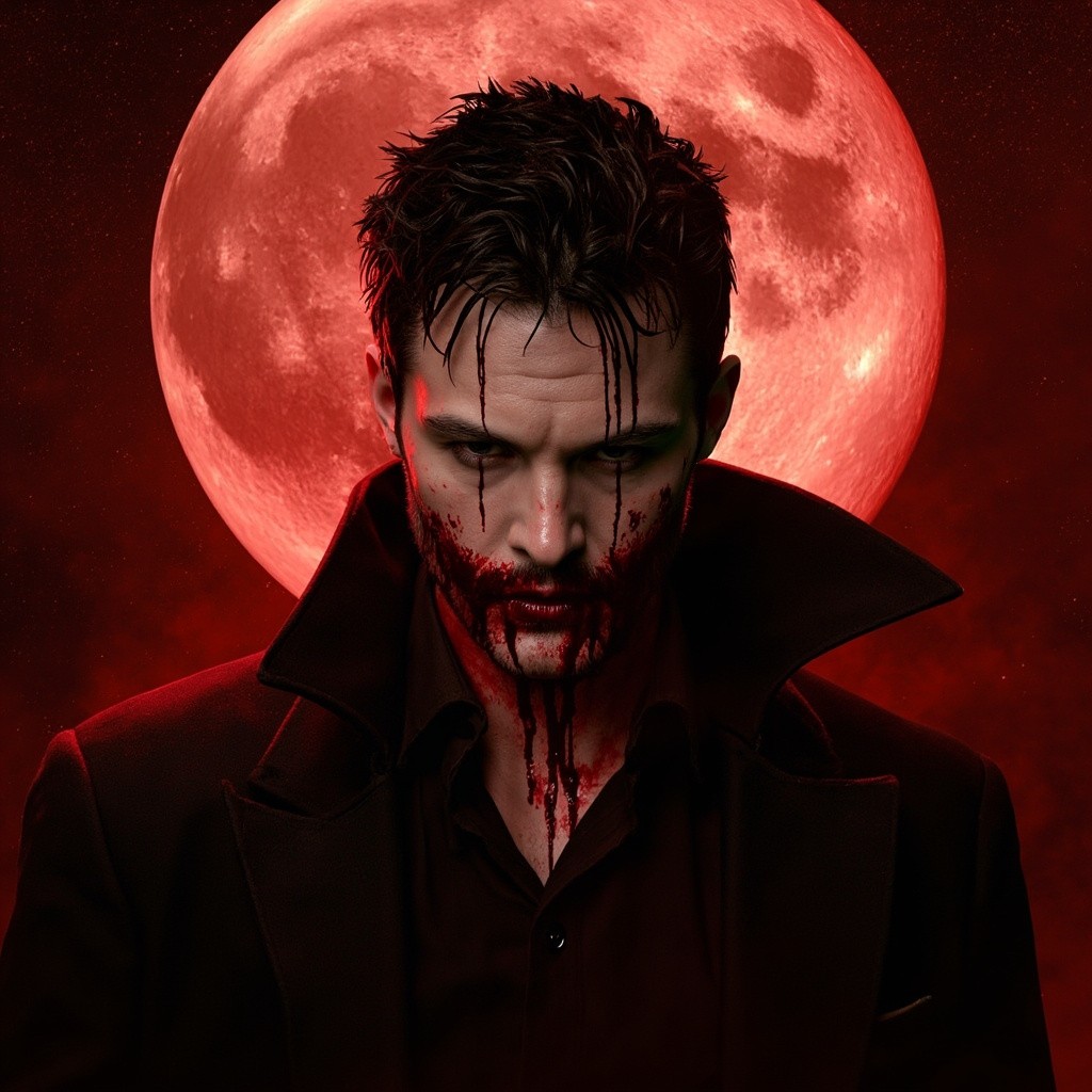 Young Vampire Covered in Blood with Bloody Moon Behind