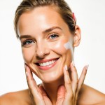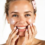 A close-up shot features a fair-skinned woman around 24 years old with blonde hair, applying a skincare product to her face. Her hair is styled with a pink clip. She has light blue eyes and is smiling, showcasing her white teeth. Her fingers are gently touching her cheek, and there's a visible sheen from the product on her skin. The background is plain white, which puts the focus entirely on her and the skincare application. The bright and even lighting highlights the texture of her skin and the product. The image is likely a promotional shot for a skincare brand, emphasizing natural beauty and skincare routines.