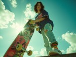 Editorial photography extreme close-up of A young woman, stands confidenty on the edge of the dystopian skatepark, holding a skateboard in front of her. Captured from a dramatic extreme low-angle ground-level perspective, the camera looks upward captures her skateboard is extremely close and massive in the frame, while her face remains in sharp focus. The skateboard filling the frame She gazes downward toward the camera with a cool, self-assured expression, She has shoulder-length dark hair and slightly messy from the wind, with subtle strands catching the sunlight Her outfit is bold and fashion-forward a oversized basketball Jersey, high-west distressed light blue denim pans and chunky sneakers with colorful striped socks peeking out out. The skeatbord, leaning upright against her legs, features a colorful, detailed design with logo "THE RABBIT', bright back sunlight, wrapping her silhouette in a glowing rim light. Blue sky with scattered fluffy white clouds in the background. Color green light vintage, details BLURRY ELEMENTS WITH A DARK PANEL, style retro Captured on a Leca BL2 with Summicron 30mm 058