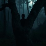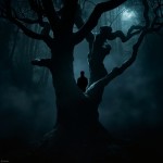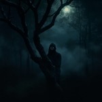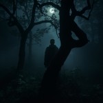 Dense Foggy Forest Night with Mysterious Silhouette Behind Twisted Tree