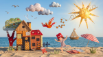 birds flying, clouds moving slowly from left to right, boat moving from right to left. sun going down to sunset. girl jumping of joy
