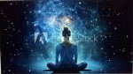 woman in lotus position meditating, seen from the back, in magical relaxing environment. colors of blue and purple, shining. Remove the text that is shown in this picture