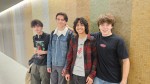 lego character of a band of 4 18 year old boys. one the letter L on his chest playing drums, another with a letter J in his chest playing base, another with a letter J playing guitar and the last on with a letter D playing lead guitar and signing to the microphone. All playing inside a garage very full with boxes on the walls and amp speakers and pedals on the floor.